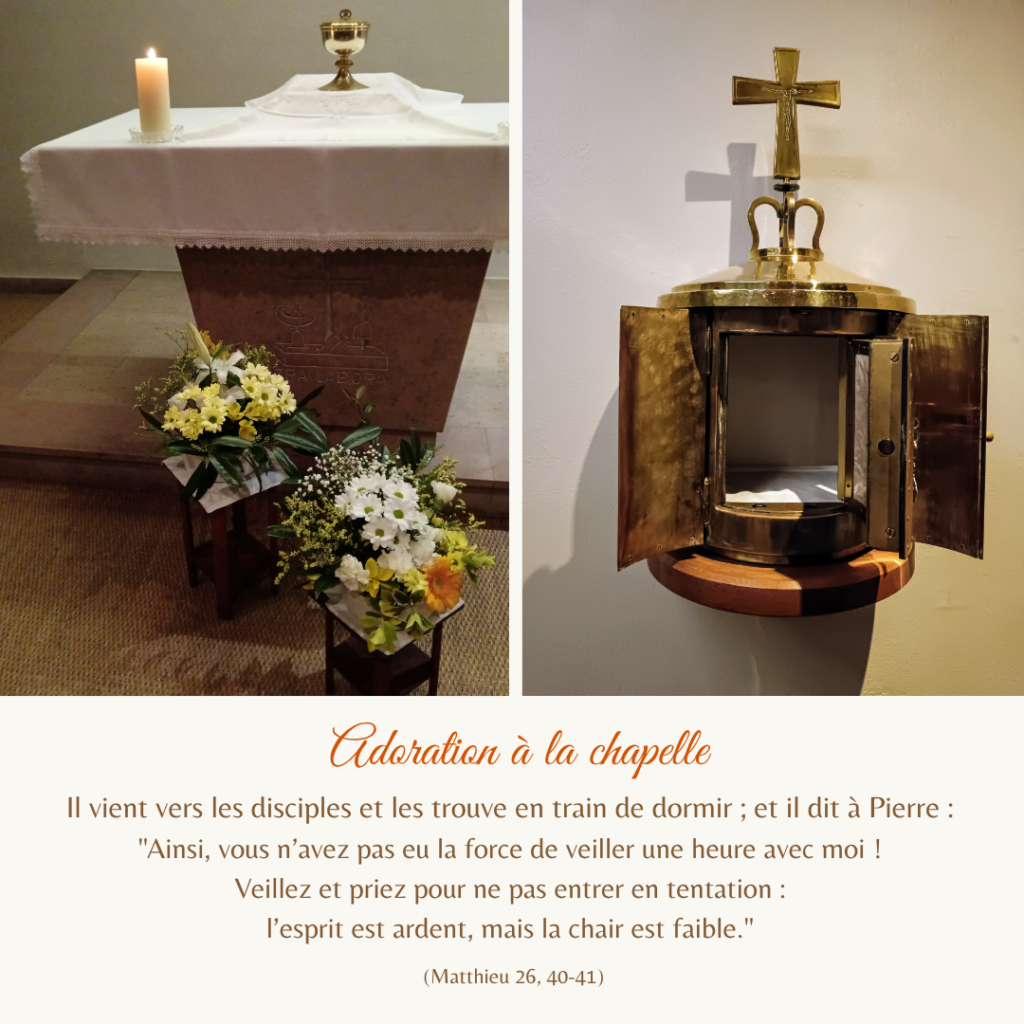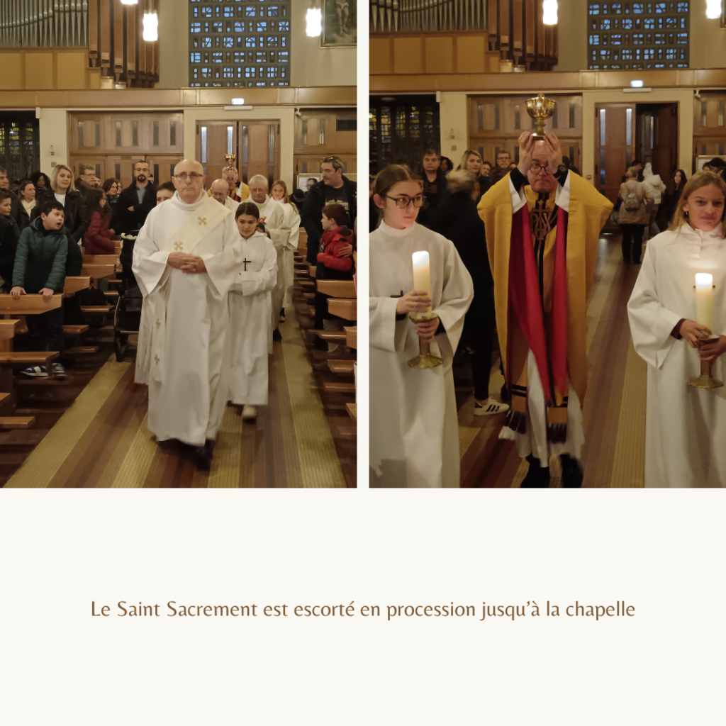 La célébration achevée, ceux qui le souhaitaient purent accompagner Jésus dans l’Eucharistie au reposoir, l’autel situé dans la chapelle de l’église. Ceux qui le souhaitaient purent adorer le corps du Christ jusqu’à 21h30.